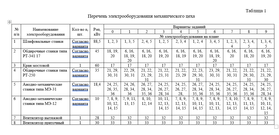№ п/пНаименование электрооборудованияКол-во n, шт.Рэп, кВтВарианты заданий0123456789№ электрооборудования на плане1Шлифовальные станкиСогласно варианта88,51, 2, 31, 3, 52, 4, 51, 2, 52, 3, 41, 2, 43, 4, 51, 2, 3, 42, 3, 4, 51, 3, 4, 52Обдирочные станки типа РТ-341 17Согласно варианта4518, 19, 206, 16, 18, 19, 206, 16, 18, 206, 16, 19, 206, 16, 18, 196, 16, 19, 206, 16, 18, 19, 206, 16, 206, 16, 18, 206, 16, 19, 203Кран мостовой160171717171717171717174Обдирочные станки типа РТ-250Согласно варианта3521, 29, 30, 3122, 29, 30, 3121, 22, 23, 29, 3121, 22, 23, 3121, 22, 23, 2922, 23, 29, 30, 3123, 29, 30, 3121, 22, 30, 3121, 22, 29, 30, 3121, 22, 23, 29, 305Анодно-механические станки типа МЭ-31Согласно варианта18,424, 25, 26, 35, 3624, 26, 28, 34, 3626, 27, 28, 34, 35, 3624, 25, 26, 27, 28, 3424, 25, 26, 27, 28, 26, 27, 28, 34, 35, 3624, 25, 28, 34, 35, 3624, 25, 26, 27, 35, 3624, 25, 28, 34, 35, 3624, 25, 26, 27, 28, 346Анодно-механические станки типа МЭ-12Согласно варианта107, 8, 9, 10, 12, 14, 157, 9, 11, 13, 158, 10, 12, 1410, 11, 12, 13, 14, 157, 8, 9, 12, 13, 14, 157, 8, 9, 10, 11, 14, 157, 8, 9, 10, 11, 12, 13, 7, 8, 10, 12, 13, 14, 157, 8, 9, 11, 13, 14, 157, 8, 9, 10, 11, 12, 14, 157Вентилятор вытяжной128323232323232323232328Вентилятор приточный13033333333333333333333